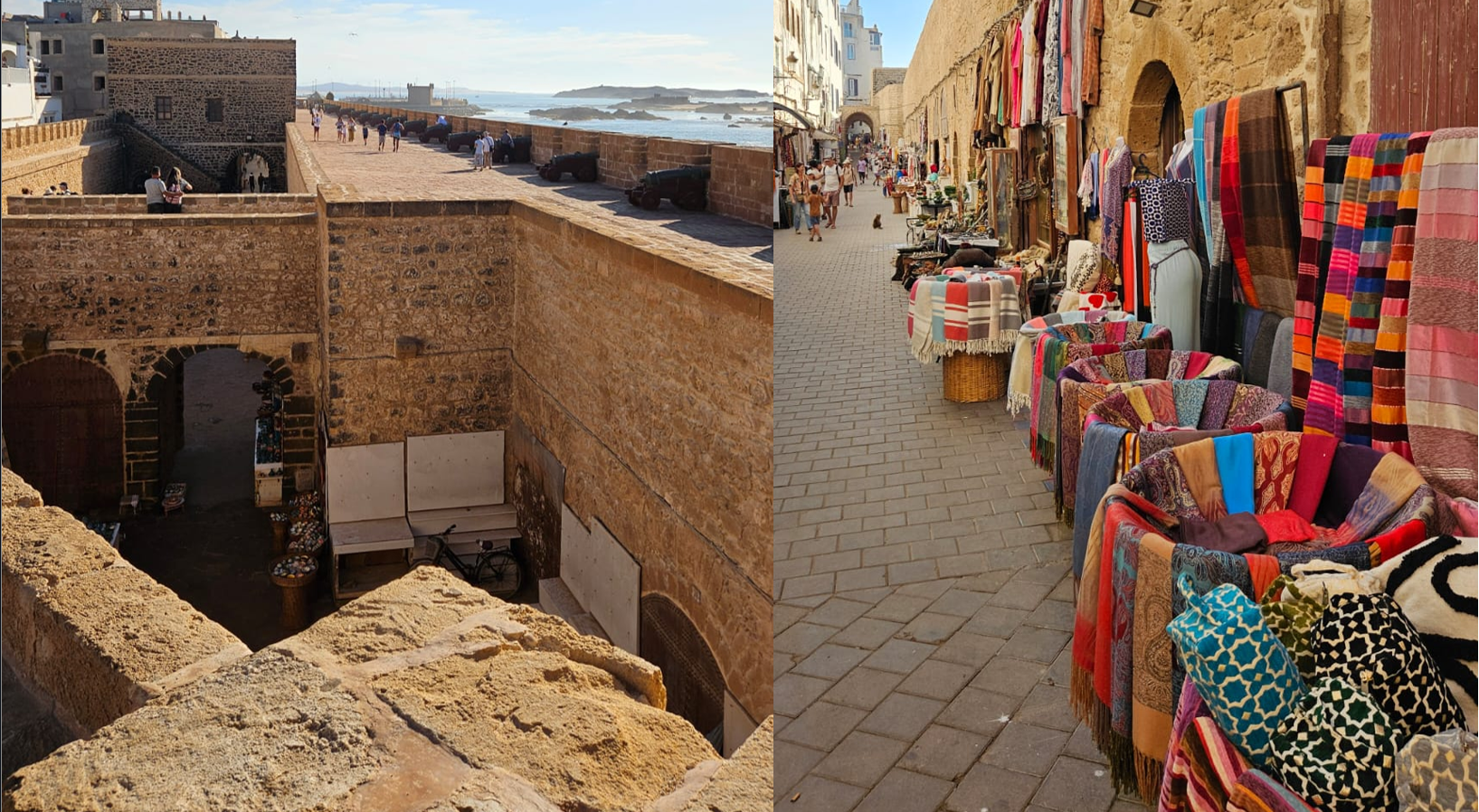 - plecam dupa micul dejun spre unul dintre cele mai frumoase orase de coasta din Maroc si din lume, Essaouira. Cunoscuta pe vremuri ca Mogador, Essaouira este un oras fortificat, pe malul oceanului, cu stradute inguste, pline de magazine, restaurante, vanzatori ambulanti, tarabe cu peste si fructe. Acum este pe lista Unesco, fiind pentru mult timp, puntea de legatura a Marocului si a zonei sahariene cu Europa si restul lumii