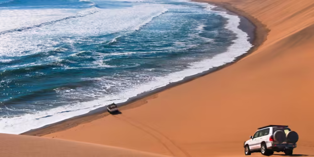 - ce inseamna? ne urcam in masini cu 4×4 pentru a explora o zona unica unde desertul se intalneste cu marea, oferind vederi uimitoare cu dunele de nisip rosu pe o parte si oceanul Atlantic albastru pe cealalta